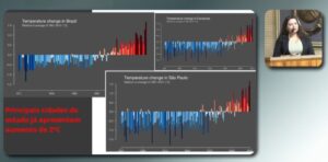 Na oportunidade, Nathália apontou que, desde meados da década de 1960, é possível observar anomalias de temperatura na região. O que foi demonstrado com gráficos apresentados pela professora, que reúnem barras que alternam entre cores azuis e variações de vermelho (que indicam temperaturas altas cada vez mais frequentes).
